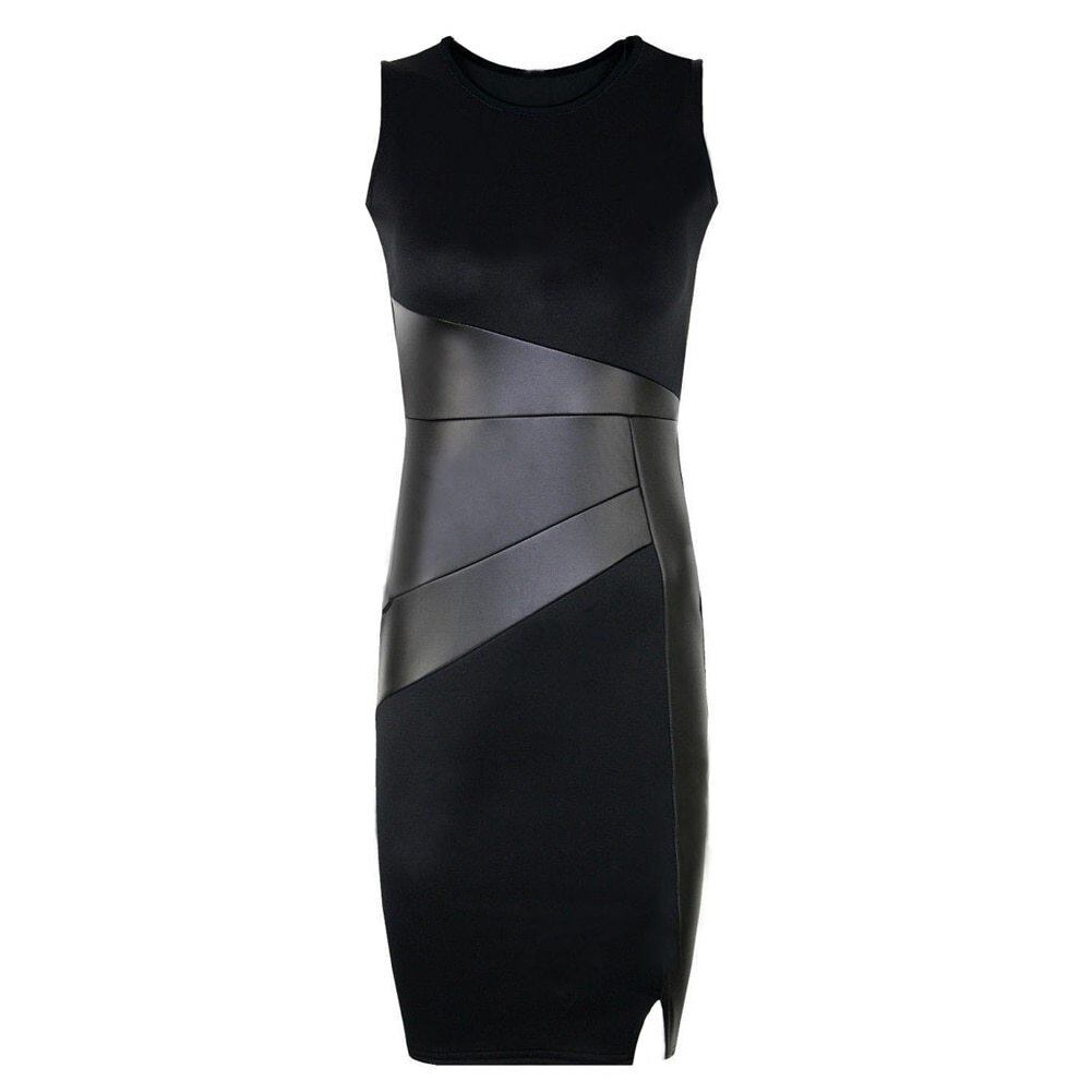 フェイクレザーOネックノースリーブエレガントスリムボディコンドレス