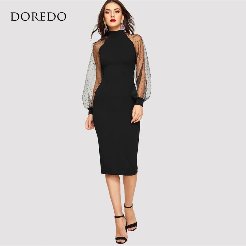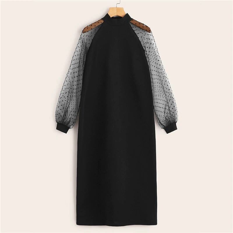 パーティージャカードコントラストメッシュランタンスリーブスプリングロングソリッドボディコンドレス